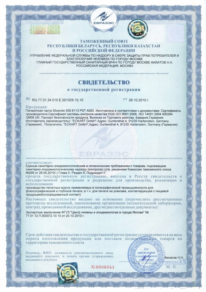 This document is required to prove that the production, storage, and transportation of the product comply with human health standards. Without this document, production and import in Customs Union countries are not possible.